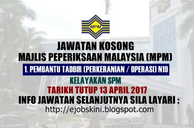Jawatan kosong kerajaan terkini di Majlis Peperiksaan Malaysia (MPM) April 2017 | Jawatan kosong terkini di Majlis Peperiksaan Malaysia (MPM) April 2017. Permohonan adalah dipelawa daripada warganegara Malaysia yang berumur tidak kurang daripada 18 tahun ke atas pada tarikh tutup iklan jawatan dan berkelayakan untuk mengisi kekosongan jawatan kosong terkini di Majlis Peperiksaan Malaysia (MPM) sebagai :