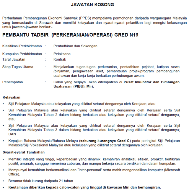 Jawatan Kosong Perbadanan Pembangunan Ekonomi Sarawak (PPES) – 10 Mac 2019